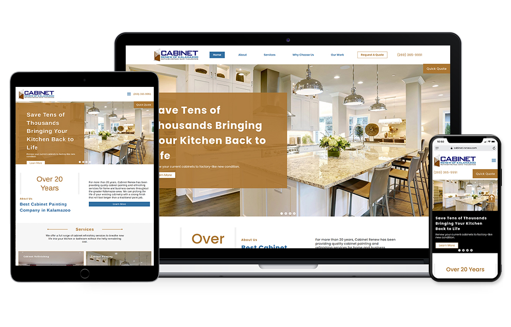Blue Fire Media designed this website for Cabinet Renew, who specializes in cabinet refreshing and painting services for homes in the greater Kalamazoo area. This site shows their process which brings existing cabinetry back to life like it’s fresh out of the factory, so instead of a full kitchen remodel, homeowners can consider just getting their cabinets refreshed. Visitors of this site can discover what cabinet renew services are all about with organized pages about cabinet refreshing, painting, staining, and full refacing. The site shows how just updating the cabinets alone completely changes the look and feel of a kitchen. Blue Fire Media made sure to include the Cabinet Renew company’s local roots and strong customer reviews front and center, making a strong first impression for first time visitors. Not to mention, clear call to action tools and accessible points of contact are also emphasized, so if a customer does want to get their cabinets renewed then they can easily do so. This project is a good example of how Blue Fire Media can bring a home-service brand into a modern and digital format that is easy to search through and reflects the company top to bottom. For more information about how Blue Fire Media can build a new responsive website for your company or organization, please contact us and let us know what you have in mind.