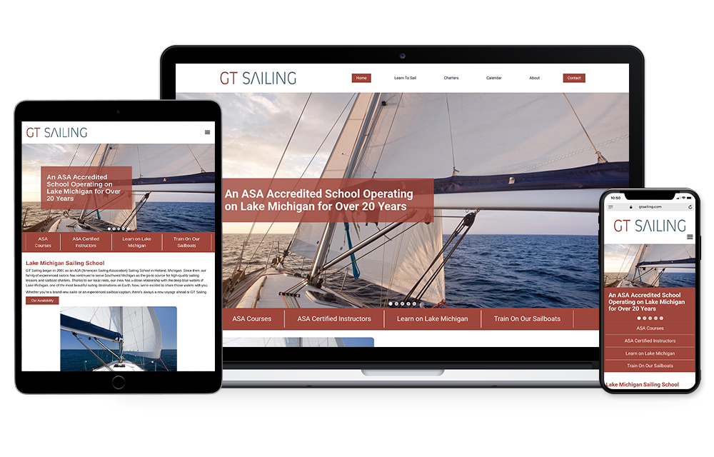 Blue Fire Media designed this website for GT Sailing in Holland, Michigan. This website features the GT Sailing team and multiple pages of information about their charter sailing opportunities and charter sailing classes for those seeking to learn how to sail themselves. There’s also pages devoted to veterans and other groups who GT Sailing offers special sailing chances to. You can use the links on the site to visit their calendar of sailing dates to claim your group’s dauntless three hour trip around Lake Michigan and Lake Macatawa, or to see what a certain sailing class entails before you decide to sign up. This is a great example of how the experts at Blue Fire Media can organize large amounts of important information for aspiring sailors or adventurous people looking for fun on the water. Customers are able to easily navigate the site while seeing all the helpful information, buttons, and breathtaking views of Lake Michigan. If you’d like to to work with the professionals at Blue Fire Media to start building your business a new website, feel free to contact us today.