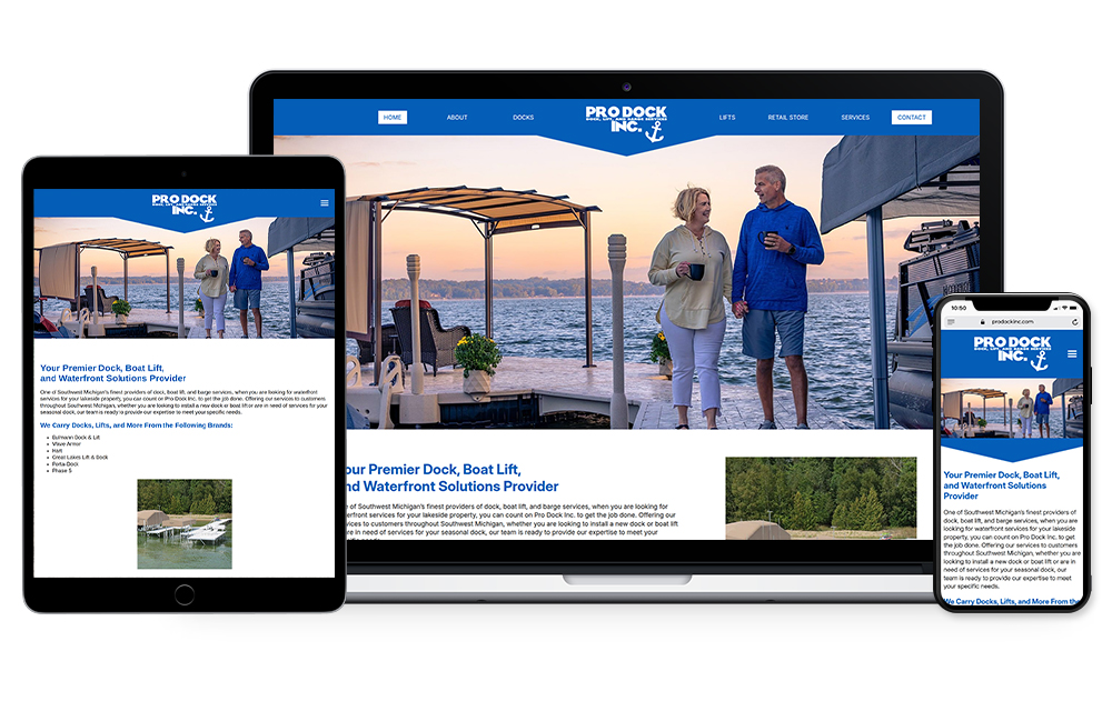 Blue Fire Media built this responsive website for a company that helps install, repair, and maintain waterfront features like docks and boat lifts. This is a simple website that is easy to navigate with plenty of information about the services they provide. The product pages also link off-site to the websites of the suppliers they use, so visitors can get more information about the docks and boat lifts before making a purchase. This website also has a blog manager where monthly posts are added to help maintain and boost their SEO rankings. There is also a link to a third-party website where customers can finance their waterfront projects. If you would like a new responsive website similar to this one for your business, contact the professionals at Blue Fire Media and let us know how we can help you today!